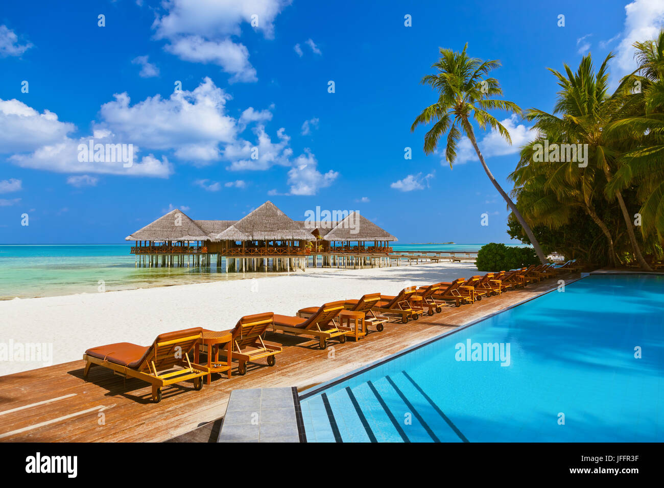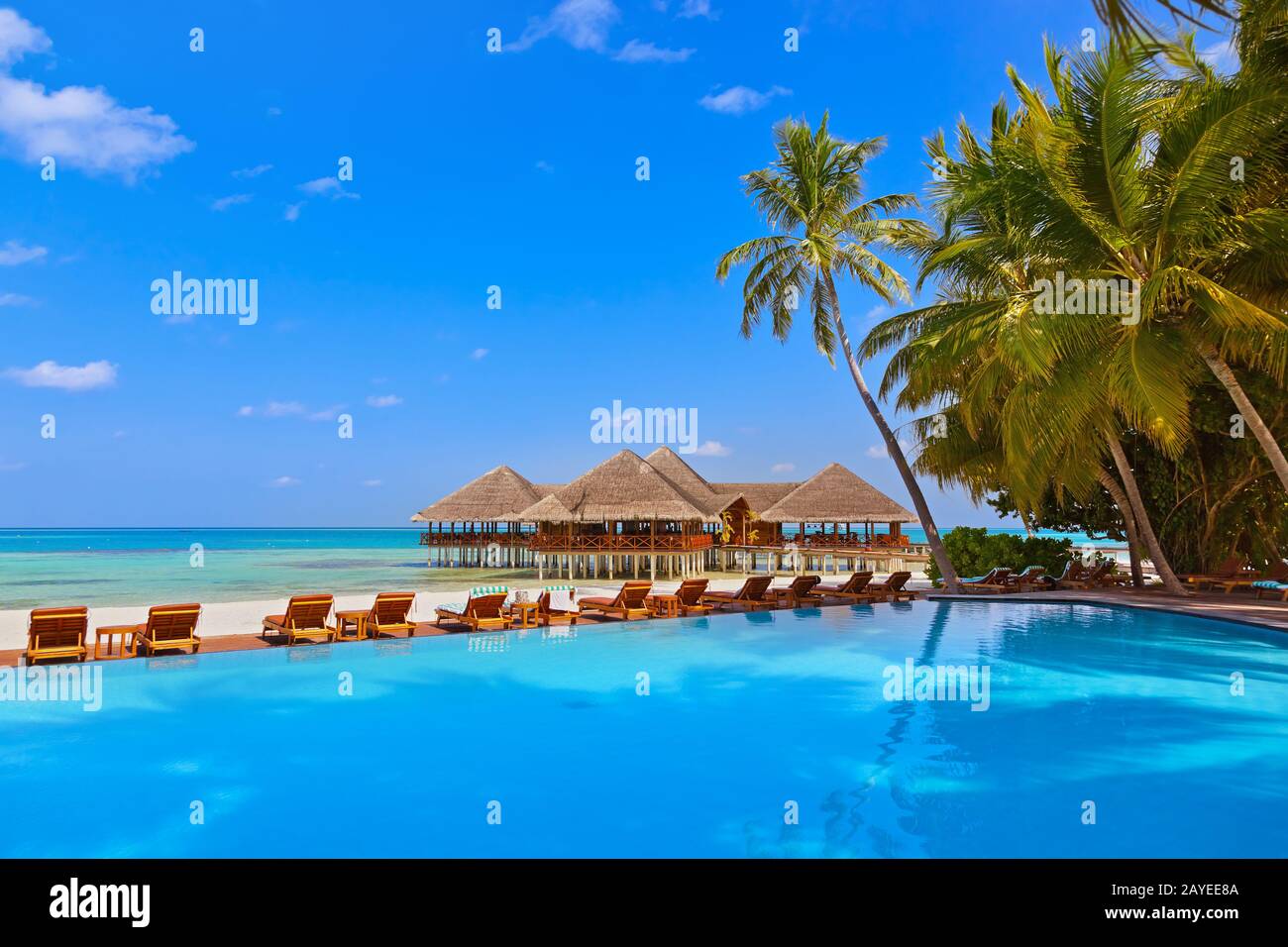 Pool And Cafe On Maldives Beach Stock Photo Alamy